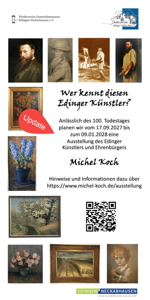Die letzte umfangreiche Ausstellung mit den Werken des Edinger Malers und Ehrenbürgers Michel Koch fand 1991 statt. Sie umfasste insgesamt 56 Bilder. Im Jahre 2001 wurden 17 seiner Werke im Rahmen der Ausstellung „Kunstwerke der Gemeinde Edingen-Neckarhausen“ gezeigt.