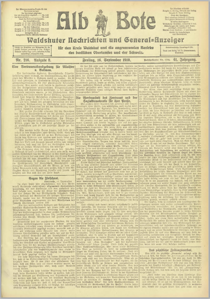 Der „Alb Bote“ ist seit dem 25. Oktober 2025 digital verfügbar auf der Seite des Stadtarchives Waldshut-Tiengen oder direkt unter https://portal.waldshut-tiengen.de:7001/sharing/Mj04sAN6A auf Seite 273 (Gesamtgröße der downloadbaren PDF-Datei: ca. 433 MB).