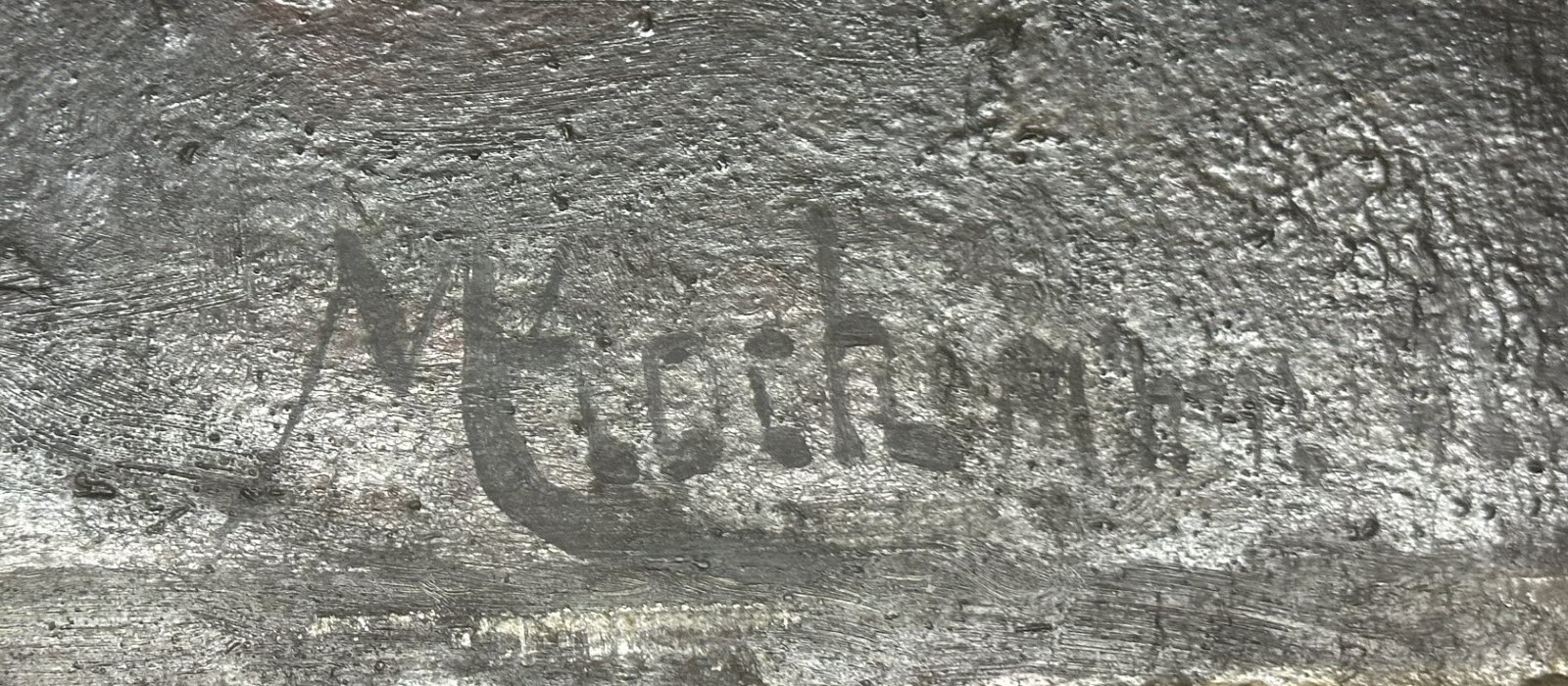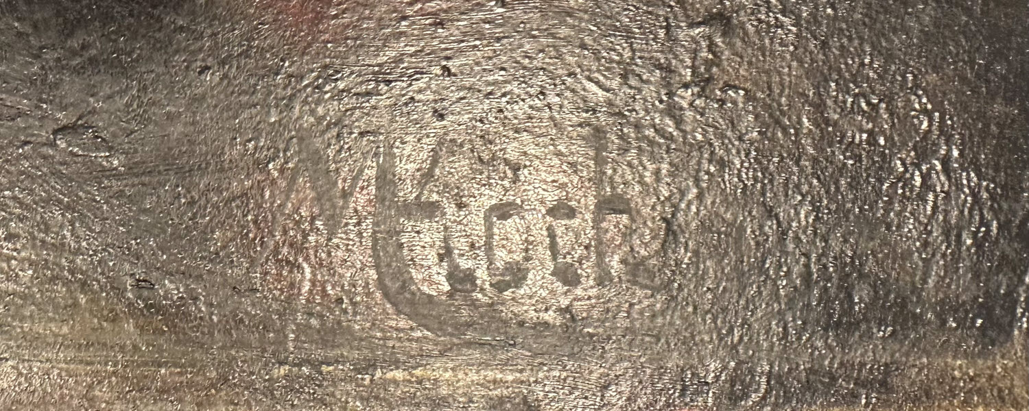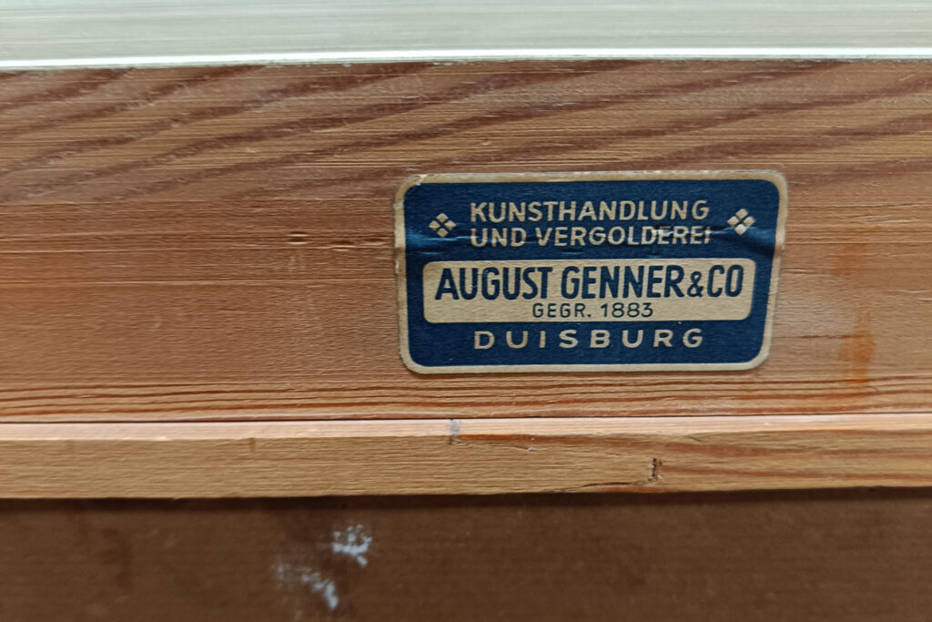 Dieses Gemälde wurde auf der linken und oberen Seite gekürzt. Die Rückseite wurde mit Packpapier verklebt. Nach dem Ausrahmen wurde die Packpapierschicht vorsichtig entfernt. Leider fanden sich nach dem Entfernen des Packpapieres keine weiteren Aufkleber aus der Nachlassliste.
