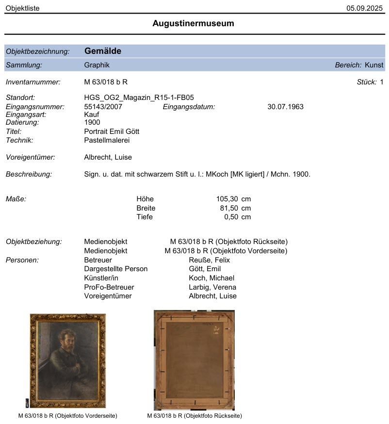 Das Gemälde „Emil Gött (Pastell)“ befindet sich laut Auszug aus dem Bestandskatalog des Augustinermuseums im Depot des Augustinermuseums (Standort: HGS_OG2_Magazin_R15-1-FB05) und trägt die Inventarnummer „M 63/018 b R“.